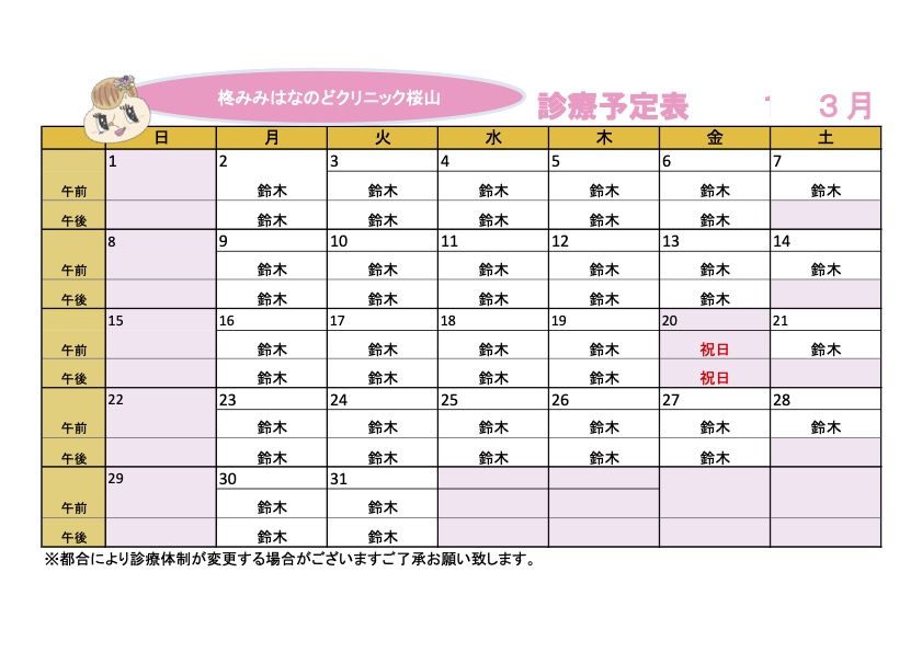 2月・3月の診療予定表です。